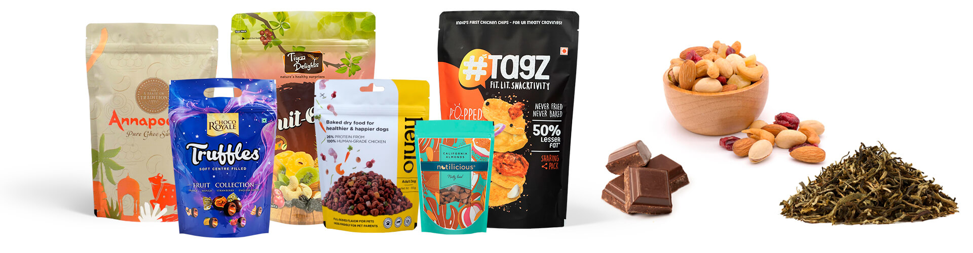 We offer two types of stand-up pouch products: stock and custom printed options.